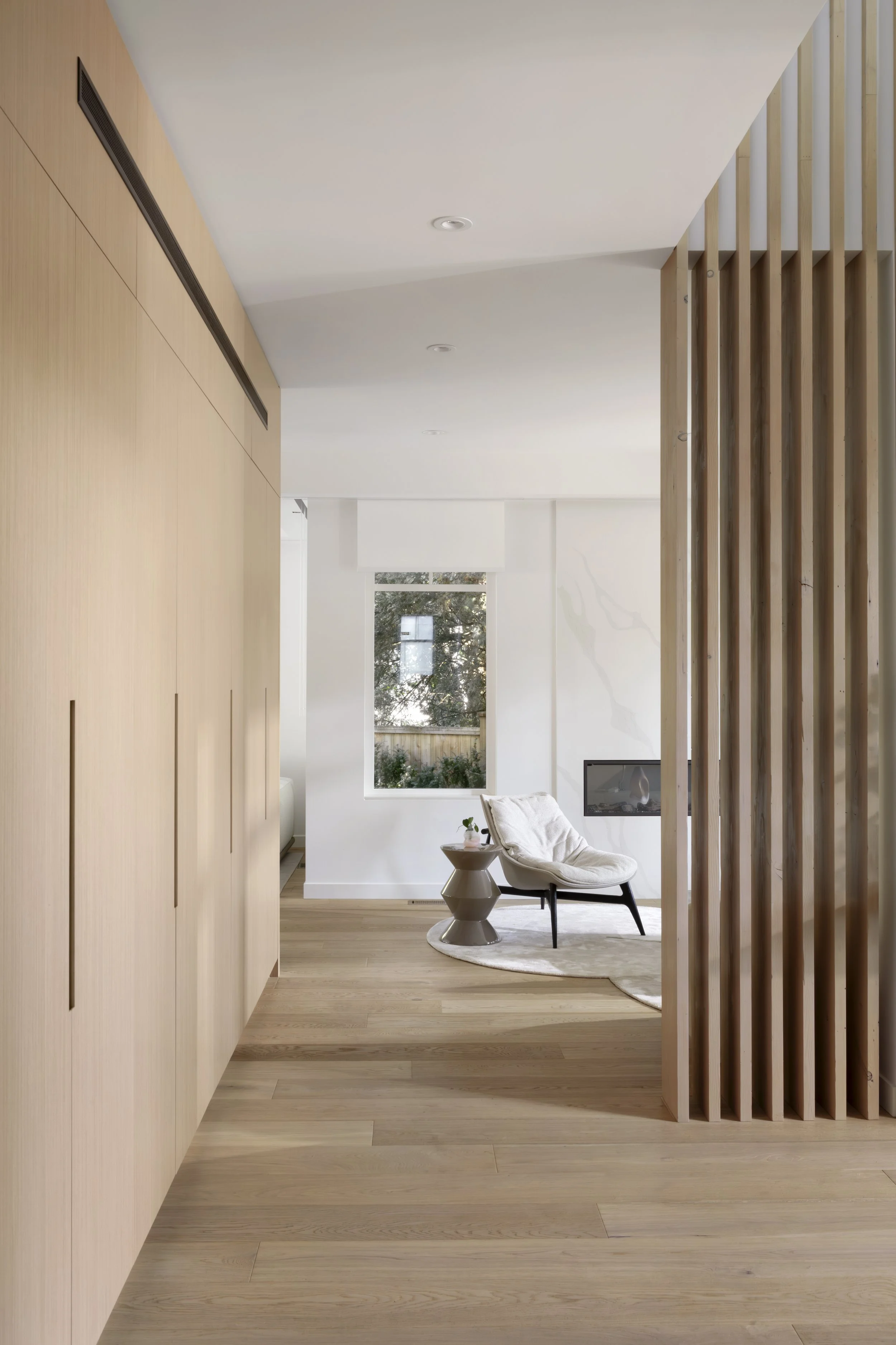 The custom millwork in TIMELESS SERENITY brings warmth and refinement to the minimalist architecture. With clean lines, natural wood textures, and seamless built-in detailing, each piece enhances flow, softens transitions, and elevates everyday living with quiet craftsmanship. From the sculptural wood-framed kitchen island to the integrated storage walls and concealed functional panels, every element balances aesthetics with purpose—transitioning effortlessly throughout the home and supporting the lived-in comfort of the family.